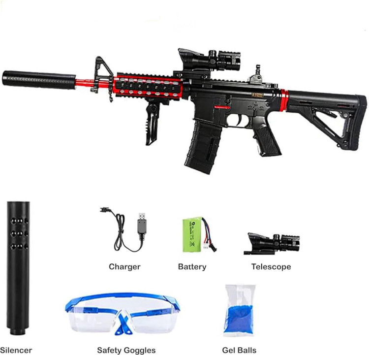 اقلام همراه: دوربین ، دسته ، خشاب ، صدا خفه کن ،عینک ، تیر ژله ، ظرف تیر ژله ای ، باتری 7.4ولت ، شارژر